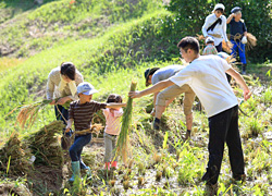 しかし、棚田でドロンコになりながらも、こんなに大変な農作業も大勢の人たちと一緒にやると効率は上がり、なぜか楽しくこなせるから不思議です。
