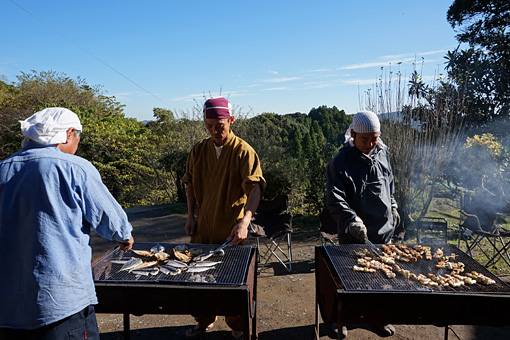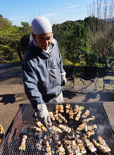 ありがたいことに炭焼き組合の仲間たちも手伝いに来てくれ、自慢の樫炭で山海の幸をジュウジュウと焼いてくれました。