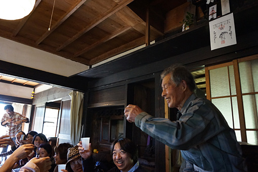 そして、古民家ゆうぎつかの板の間にはずらりとご馳走が並び、いよいよ乾杯の時を迎え、真っ先にこの会員になってくれた村の最長老こんぴらさんに乾杯の挨拶をして頂きました。