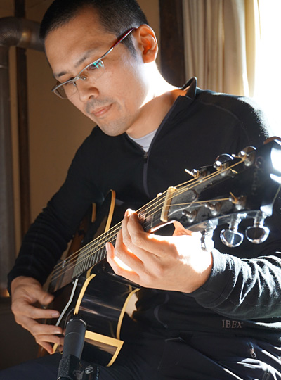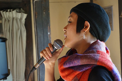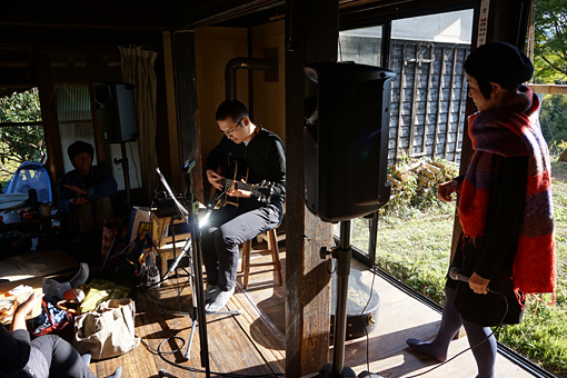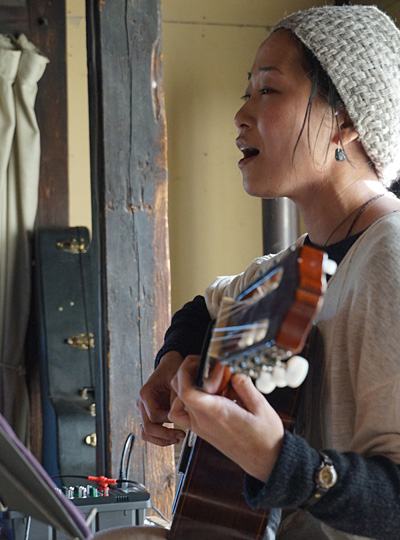 里花さんが静かにギターを爪弾きながら、マイクを通さず素の声でオリジナル曲の「満月の夕」を歌いはじめると、その透き通った声と詩とメロディーがひとつとなって、古民家に優しく響き渡りました。