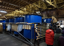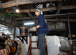 歌う杜氏たちの"心の良い状態"が響きとなって、それが微生物にも伝わり、結果良いお酒になるのではないかと思いますと言い、良く響く木造の酒蔵で、優さんは伝統的な仕事唄を伸びのある声で歌ってくれました。