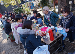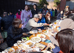 昼食会では、80名もの参加者が持ち寄った多種多様な料理がズラリと並び、テーブルの上は壮観です。