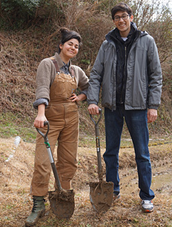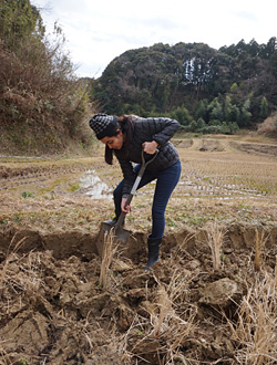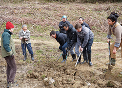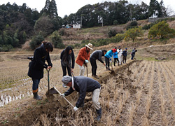 意見交換の後は棚田へ行き、学生たちに田んぼ作業にとって重要な「くろきり」作業をしてもらいました。