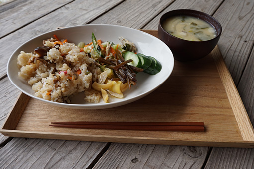 メニューは、竹の子のまぜご飯、呉汁入の味噌汁、春野菜となまり節の酢味噌あえ、キャラブキ、ぬか漬、よもぎの柏餅です。