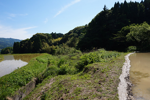 ここは約30年前に放棄され、荒れ果てて竹やすすきに覆われ藪になっていた農地ですが、僕はここを「現代の楽園」に再生しようと、4年前から都会の人たちと少しずつ開墾してきました。そして、2枚の棚田は復田しました。集落の一番奥の山の中の耕作放棄地とは、ある意味で現代社会に見捨てられた場所とも言えます。しかし、南向きの斜面で日当たりはよく、横には小川があり、北に山を控え、電柵の内側なので動物の被害も少ないという土地は、逆に「現代の楽園」になる可能性を秘めています。