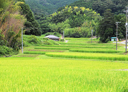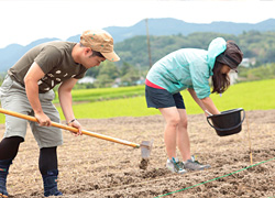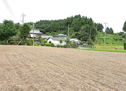 古民家ゆうぎつかから山を降りて10分くらい歩いていくと、集落の真ん中に1日中陽が当たり、棚田の村には珍しく真っ平らな約7畝の畑があります。