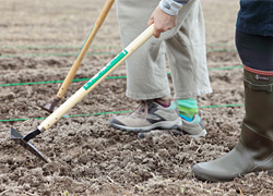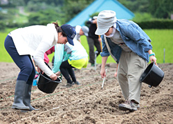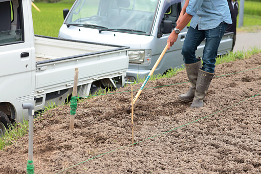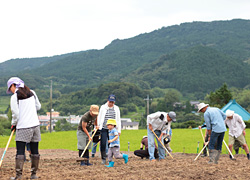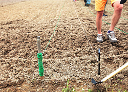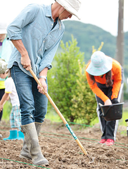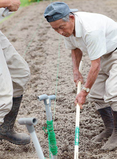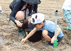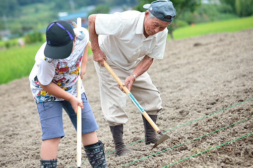 まずは畑に紐を張り、それに沿って三角ホウで溝を掘ります。その溝に地大豆の種を蒔き、蒔いた後は土をかぶせていきます。その作業をみんなで分担して行いました。子供たちもよく働き、大人たちと素晴らしいコンビを組んで、どんどん作業がはかどりました。