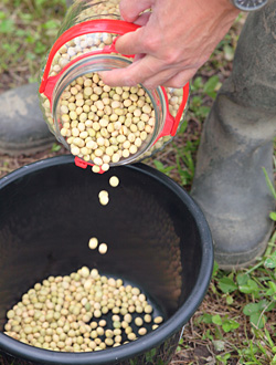 7月23日土曜日は、その畑で「手づくり味噌の会」の参加者のみなさんと地元のおばあちゃんからもらった在来種の地大豆の種蒔きをしました。