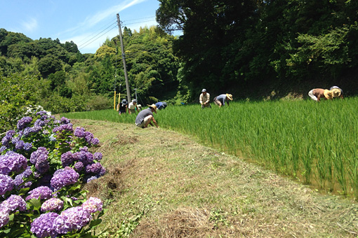 自然酒の会は、釜沼北集落の天水棚田を保全するために、会員のみなさんと共に田植えから草取り、そして稲刈りを経て、みんなで育てた無農薬米を寺田本家にて鎌倉時代のお酒を再現した自然酒「天水棚田」を仕込んでいただく年間プロジェクトです。