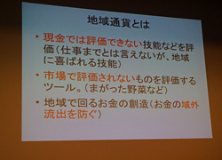 司会進行を勤めてくれた地域通貨「よろず」の高橋靖典さんは、法定通貨と地域通貨の違いをこう説明してくれしました。