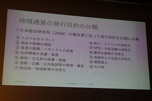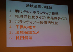 地域通貨には、通帳型、紙幣型、ウェブ型など様々な種類がありますが、地域通貨と急速に進化するIT技術の融合により、今後全く新しい通貨も生まれる可能性についても議論されました。また、興味深いことに通帳型地域通貨を利用した人の多くは、人と人とのつながりが深くなり、"意識の変容"が起きるという研究者からの発表もありました。