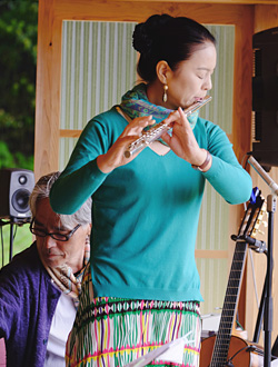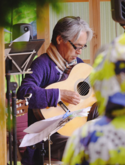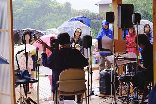 みなさん傘をさし、レインウエアを着て、雨の中の野外コンサートとなりましたが、鋸南町在住で邦楽を代表するギタリストの千代正行さんと斎藤隆広さん、さらに世界的に活躍するフルート奏者の吉川久子さんも来てくださり、心地よいナチュラルな音楽を奏でてくれました。