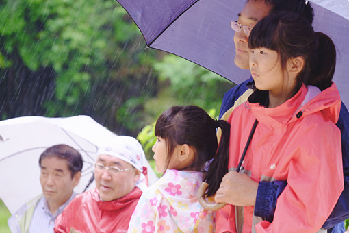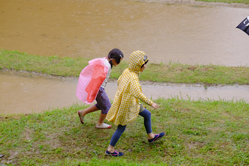 雨の降る中、都会からはるばるこの里山へやって来たのですから、気合が入っています! みなさん、レインウエアを着て喜々として棚田へ来てくれました。