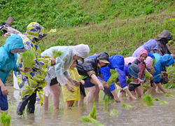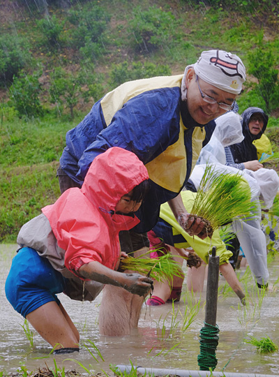 宮沢賢治の雨ニモ負ケズ、風ニモ負ケズのように、僕らは雨に濡れながらワイワイと田植えをしました。と言っても、この雨なので無理せず2枚の棚田だけやり、残りの田植えは後日、良品計画さんの新入社員研修でやってもらいました。
