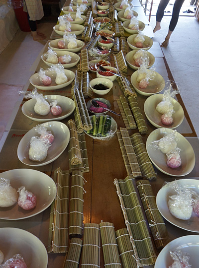 古民家ゆうぎつかの土間のテーブルに、「しろうべえ」さんが用意してくれた材料を並べて、太巻き祭り寿司づくりは始まりました。
