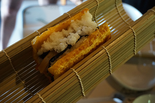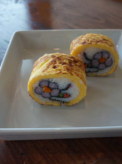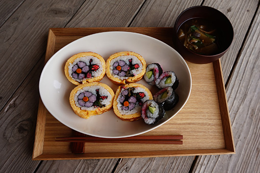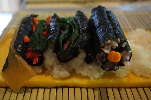 「しろうべえ」さんに教わるとおりに、まきすだれの上に玉子焼きをのせ、ご飯を広げて、海苔やかんぴょう、ゴボウ、紅しょうが、ほうれん草などの野菜を並べていきます。