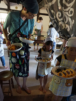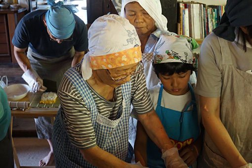 7月8日(土)の「有機米の会」は、集落の料理上手なおばあちゃんの「しろうべえ」さんと「こへいだ」さんに講師を依頼し、房総半島の郷土料理である太巻き祭り寿司づくりを行いました。