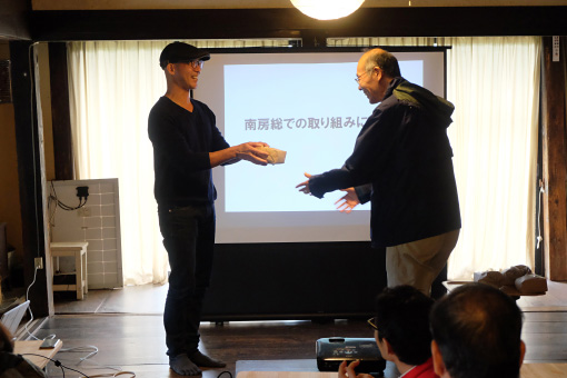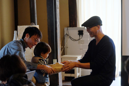 収穫祭で僕はこの一年間、お米づくりに通ってくれたみなさんに感謝の気持ちを伝え、一緒に天水棚田で育てた無農薬無化学肥料・天日干し・長狭米の新米をお渡ししました。