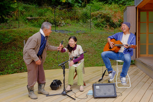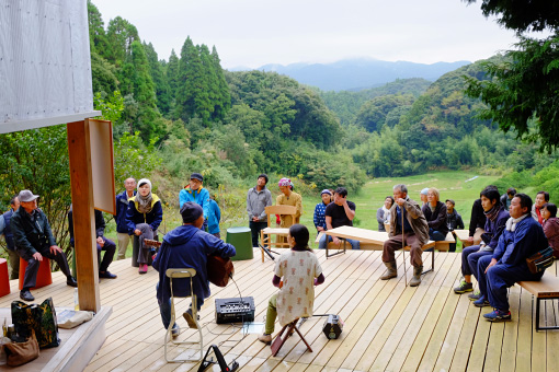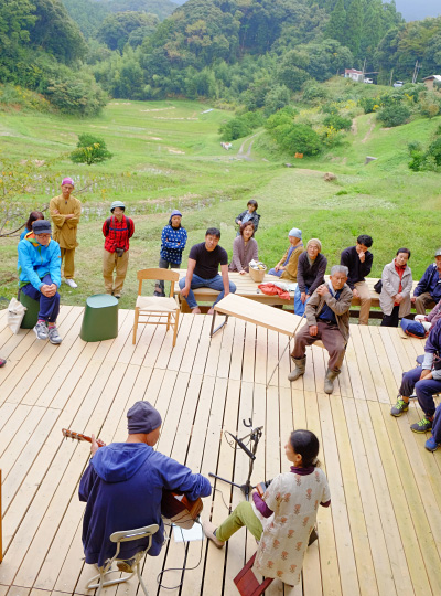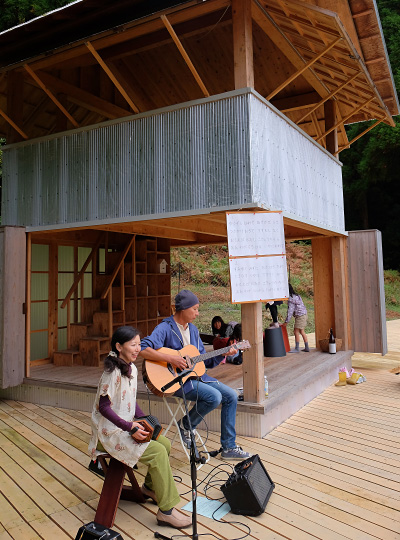 食後は棚田のウッドデッキで半農半翻訳者の吉田奈緒子さんが演奏するコンサーティーナとまっちゃんのアコースティックギターのアイリッシュ音楽のコンサートを行いました。