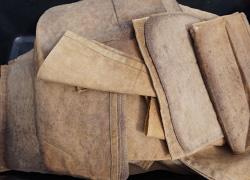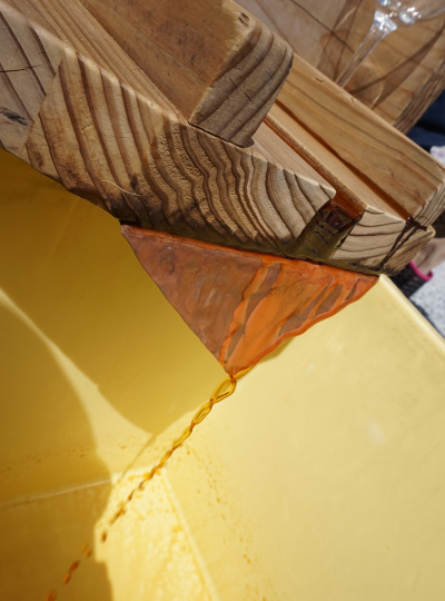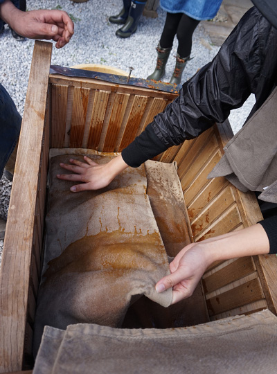 そのもろみを大きなひしゃくに半分くらいすくって搾り袋に2杯入れ、「安房手づくり醤油の会」が出資して家具職人に特注で製作してもらった醤油船の中へ置いていきます。