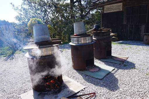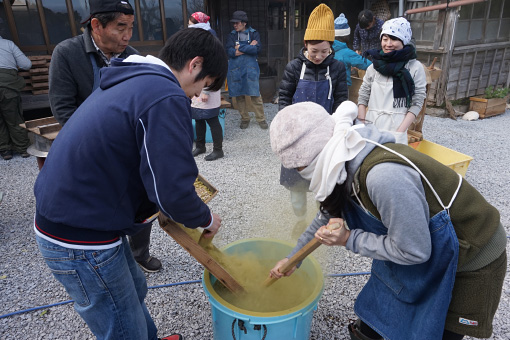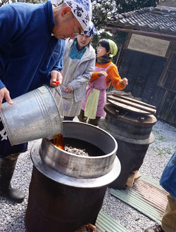 当日は味噌仕込みと同じように、朝から大鍋でお湯を沸かしておきます。