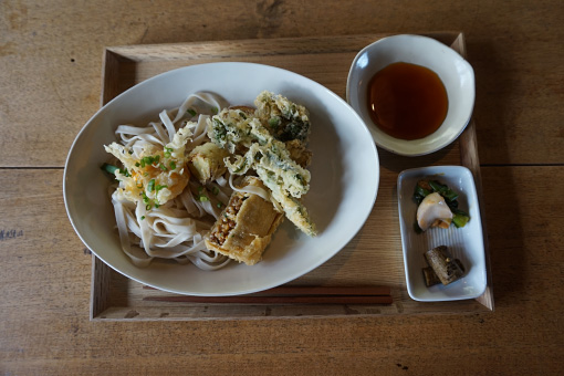 里山料理人「こころ」の木村夫妻が季節の野菜をサックサックに揚げてくれた天ぷらと、僕が育てた釜沼産有機小麦でつくった有機うどんをしぼりたての生醤油で食べる昼食は絶品でした。