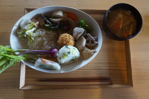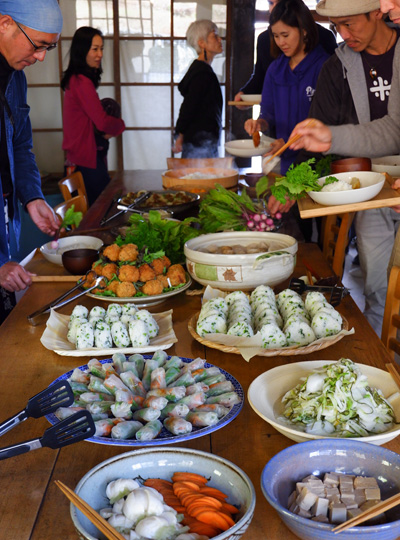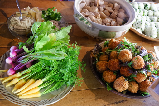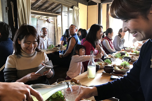 収穫祭の料理は「もみじの手」の守井美奈子さんが地元食材で美味しい発酵料理をつくってくれ、土間のテーブルにはズラリと大皿料理が並びました。