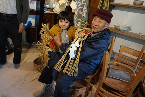 古民家「ゆうぎつか」でのワークショップには講師に畑中亨くん、長老の瀬戸さん、五一さん、そして昼ごはんの料理は木村夫妻と鴨川オールスターで開催し、みんなでしめ縄飾りを作り、その後はみかん狩りを楽しみました。