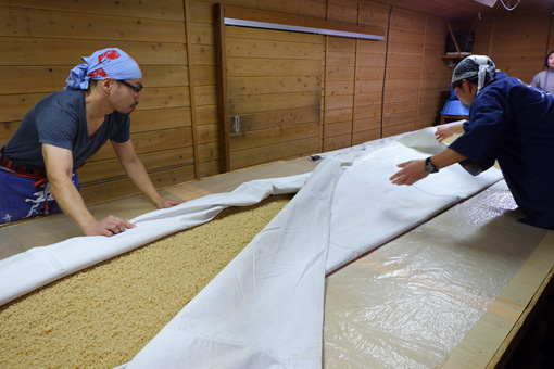 「うちは雑菌も野生の菌も大歓迎で、あらゆる菌と共生するお酒づくりをしています。」と言って、普通の酒蔵では絶対にありえないことですが、24代目当主の寺田優さんは麹室へ見学者を全員入れてくれます。