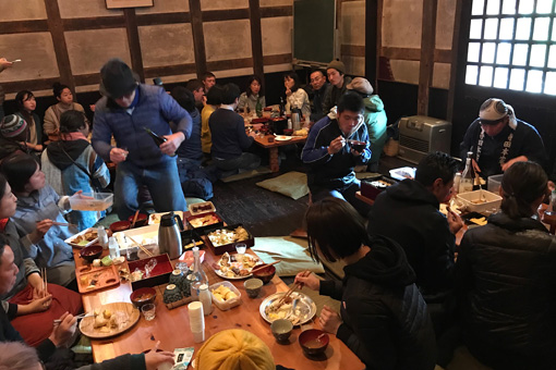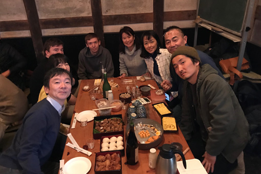 蔵見学後は一品持ち寄りの昼食会です。寺田本家の色々な自然酒を試飲させてもらいながら、みんなの手づくり料理をシェアすると、それは素敵な持ち寄りパーティーとなり、僕らは昼間からほろ酔いで「大人の冬の遠足」を楽しみました。
