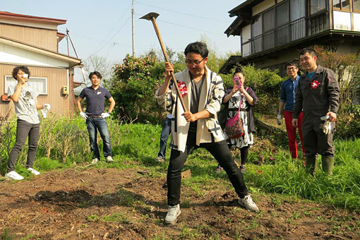 続いて、大名の松橋さんと一緒に畑を耕す開墾イベント。古民家のすぐそばにある土地を一から開墾して、今後はここで野菜や木苺を育てます。「みなさん、今の風景を覚えておいてください」と松橋さん。ただの荒れ地から夏には畑へと生まれ変わり、たくさんの野菜や果物が収穫できるようになります。きっと次回訪れた村民たちはその変わりように驚くはず。