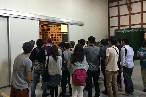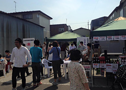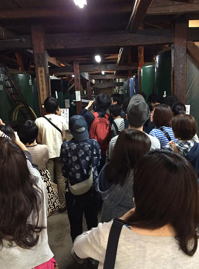 山菜や地元の食材が並ぶ朝市を散策した後は、五城目町にある酒蔵「福禄寿」の蔵見学に行き、酒造りの歴史や行程を学びました。できあがった日本酒が積まれた冷蔵庫の扉を開けた時には「おー!」という村民たちの歓声が蔵に響きました。