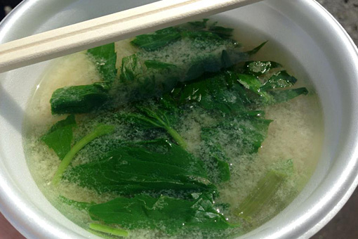 「しどけの味噌汁無料だよ~」という地元の方の声に、村民たちもお味噌汁を食べるため行列を作ります。「美味しい! 美味しい!」という村民たちの声に地元のおじいちゃんおばあちゃんの笑顔も溢れます。