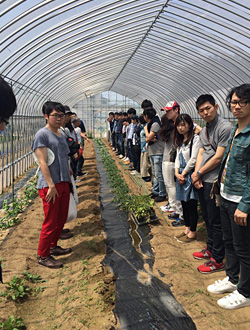 町を見て回った後は車に乗り込み、農業体験をするため大名の松橋さんの畑へ移動しました。大きなハウスの中ではアスパラが元気いっぱいに育てられていました。