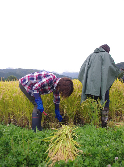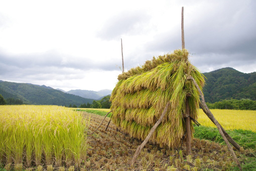 昔ながらの手作業で稲を刈り、刈った稲を藁で結び、稲架がけという手法で天日干しをしていきます。