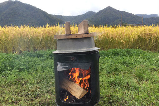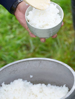 羽釜を使い、刈り終えた田んぼの横で新米を炊き、参加者全員でお昼を食べました。
