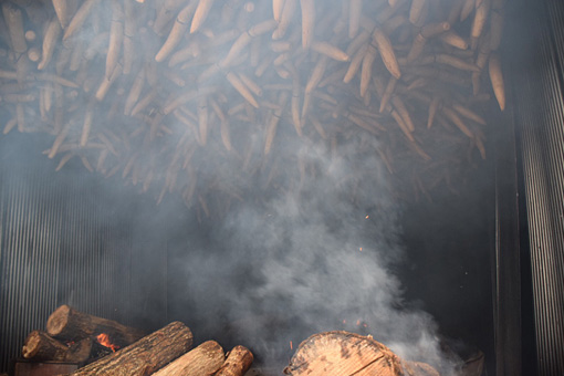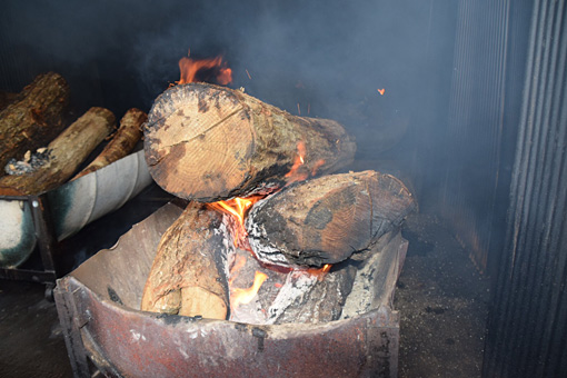 5日間火を絶やしてはいけないので男たちは燻し小屋の中で薪をくべ続けます。