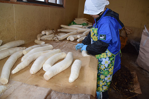 いぶりがっこの仕込みは雪が降り始める前の10月頃から始まり、12月には仕込み終わります。