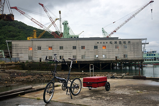商船学校のすぐ先で内陸に入り、一山越えて反対側の木江地区に出る。古い家並が残っていると聞いていたが、空き家も多く放置された家が目立つ。湾にある大きな造船所から響くガーンガーンという無機質な音ばかりが冷たく鳴り渡っていた。