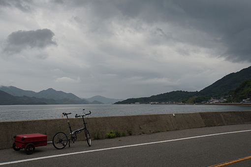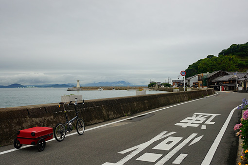 木江から明石港までの海岸線沿いは、瀬戸内海の多島美が感じられる風光明媚な道だった。惜しむらくはこの天気だ。晴れていれば小躍りしたくなるような景色が堪能できただろうに 。空はいよいよポツポツと雨脚が戻し始めていた。急がなきゃな 自転車のギアを一枚重くしてスピードを上げると前方から小さな影が近づいてくるのが見えた。