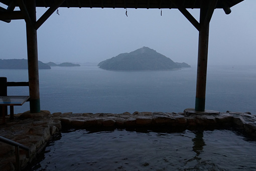 きのえ温泉清風館は小高い崖の上に建つ立派な旅館だった。崖っぷちに露天風呂がせり出していてとてつもないロケーションだ。雨で滲んで水墨画のようなモノクロの濃淡で描かれる島々を眺めながら、ぽかぽかの温泉に浸かる。冷え切っていた体温が揺り戻されていくのが分かる。なんという贅沢だろうか。この素晴らしい温泉も船の時間を間違えていなければ味わうことなく去っていたはずだ。