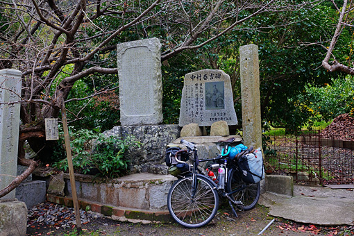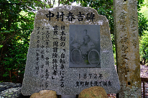 中村春吉は1902年から1903年にかけて日本人初の自転車世界一周を果たした男だ。中国、シンガポール、ミャンマー、インド、イタリア、フランス、イギリス、そしてアメリカを周遊したという。いわば僕の大先輩みたいな人間だ。その春吉の生まれ故郷が大崎下島の御手洗で、地区の天満神社には彼の偉業を称える碑石が立っている。