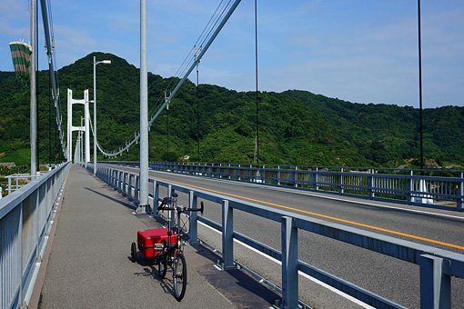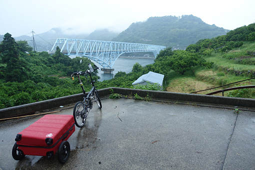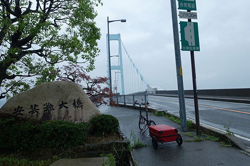 一時間ほど見学をしていると、少しだけ雨が弱まった。このチャンスを逃すかとばかりに自転車に跨がり、とびしま海道の出口であり本土の入口・安芸灘大橋へと向かった。