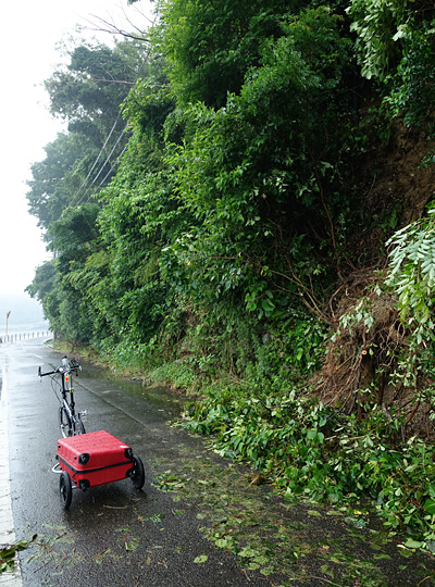 昨晩泊まった宿の女将の話によると、昨日も晴れたのも実はごく一部の場所だけで、あとはずっと大雨だったらしい。それを示すかのように、宿を出発してしばらく走った先では雨による土砂崩れで道が通行止めとなってしまっていた。