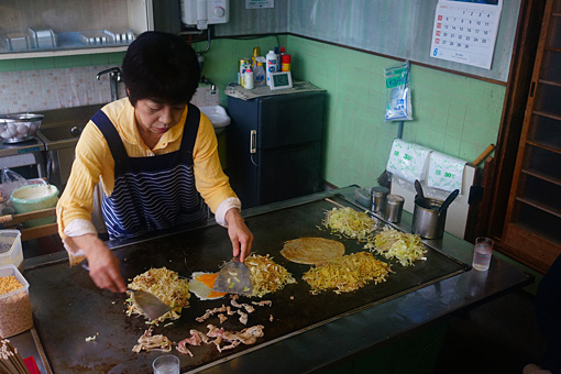 壁にくっついた細長いテーブルにスツールが3つだけの店内で、お母さんが一人、鉄板でジュージューカンカンとやっている。雨ですっかり冷えていた僕にとって、その光景は見ているだけで暖かくなった。その最中にひっきりなしに注文の電話がかかってきていた。店は小さくとも人気の店なのだろう。
