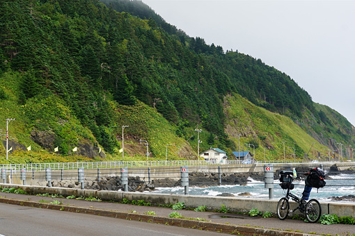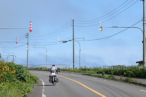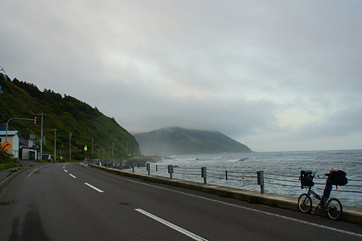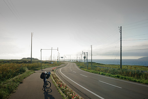 町の外れに出ると、前方に見覚えのある影を発見した。長野のおじさんだ。「おぉー」とおじさんもこちらに気付いて手を挙げてくれた。道路を挟んで立ち話をすると、彼は僕が今目指している島のもう一つの港の沓形(くつがた)から走ってきたそうだ。今晩は鴛泊に泊まるそうなので、僕とは真逆のルートということになる。