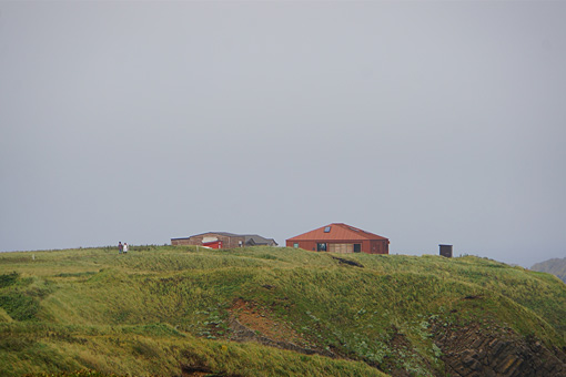 背の高い木々が一本も生えていない草原の先端に赤茶色の建物が見えた。スコトン岬の土産物屋だった。