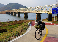 僕は以前、この自転車道に沿ってソウル近郊の仁川から釜山までを走ったことがあるけれど、それだけでいたく感動したものだ。開けた気持ちいい川沿いを走り、廃線になった鉄道トンネルを抜け、山間に抱かれた温泉街を通る、ただ走るだけでない"楽しめる"自転車道だった。