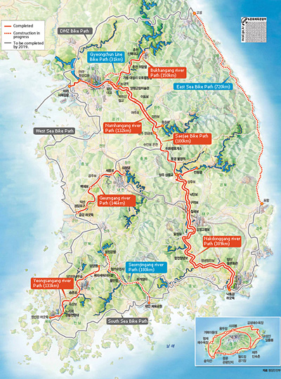 もともと韓国では国を挙げて自転車道の整備に力を入れている。李明博政権時代に掲げられたグリーンニューディール政策という河川再開発の下、各地に自転車道が作られた。