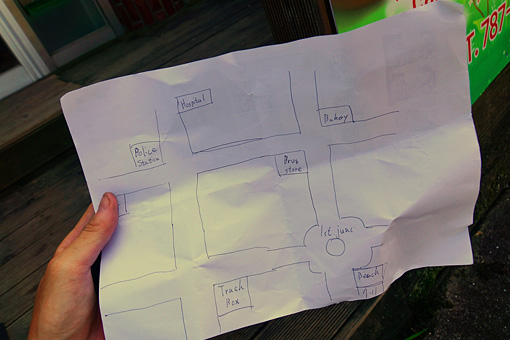 人心地がついたところで自転車屋がないか尋ねてみると、店員やその場に居合わせたお客が知恵を持ち寄って、一枚の地図を書いてくれた。縮尺もアバウトでシンプルな手書きの地図ながら、それは自転車屋へ至るための必要なランドマークが欠かさず記されたパーフェクトな地図だった。